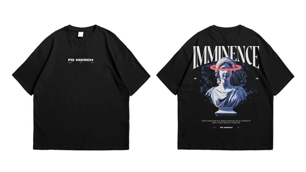 The Imminence Oversized Graphic T-shirt merges classical art with modern minimalism. Its back design features a blue-toned marble statue crowned with a red ring, symbolizing focus and higher vision. The text beneath reads: “Great things are not done by impulse, but by a series of small things brought together.” Designed with soft, breathable cotton, this T-shirt offers a relaxed streetwear fit suitable for any season.